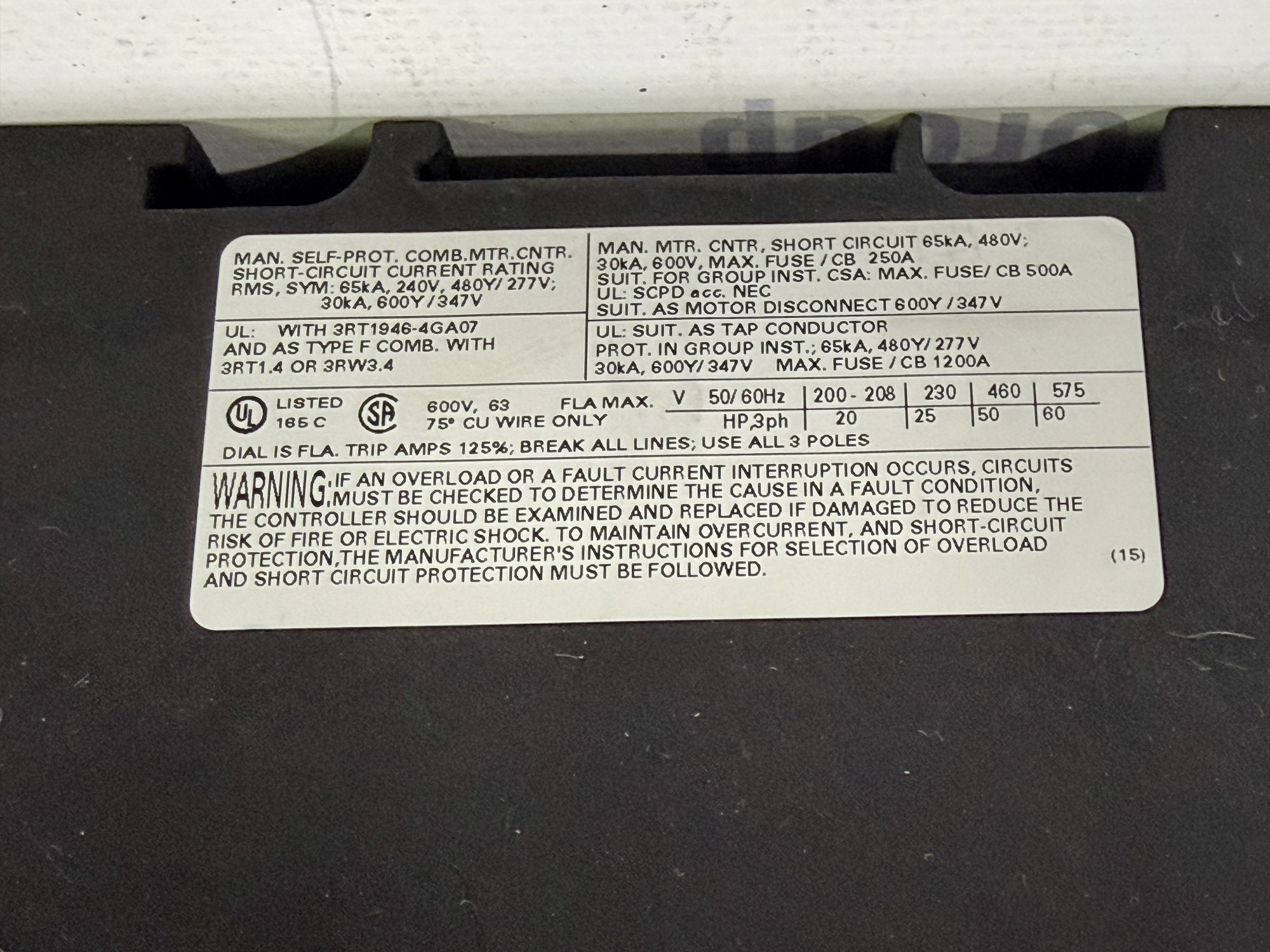 Діапазон налаштування теплового розчеплювача: 45 – 63 А.