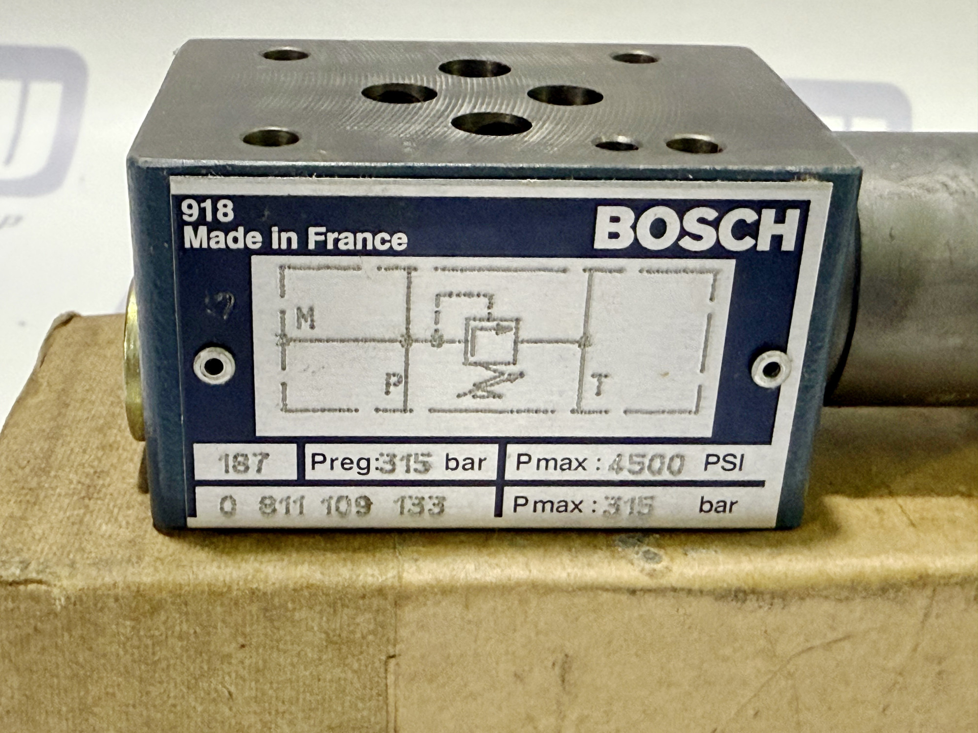 Продається оригінальний гідравлічний запобіжний клапан Bosch, артикул 0811109133. Високоякісний промисловий компонент, виготовлений у Франції. Клапан призначений для модульного монтажу (плиткового виконання) у гідравлічних системах.