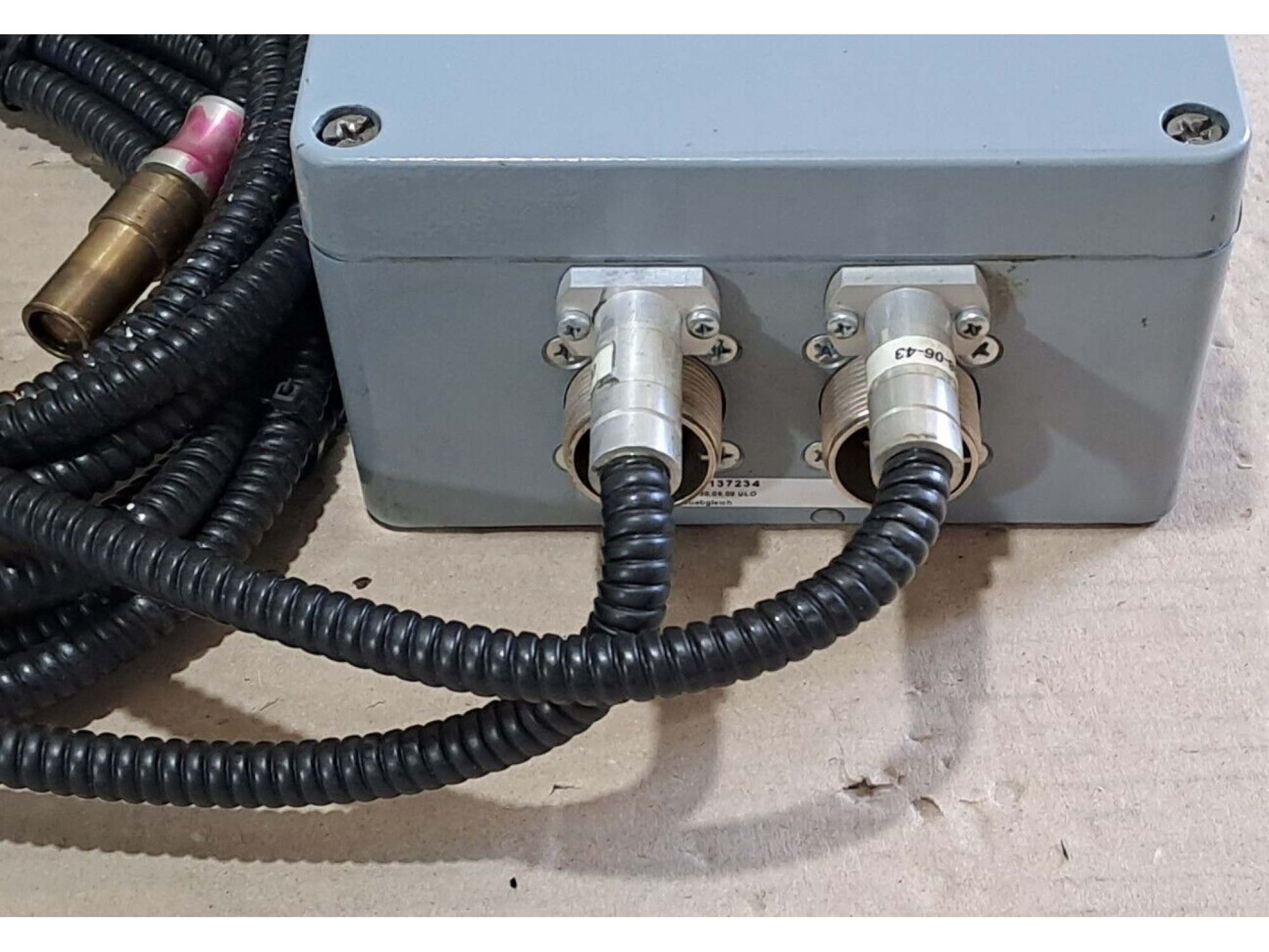 Connectors: Features two round multi-pin industrial connectors for external cable connections.