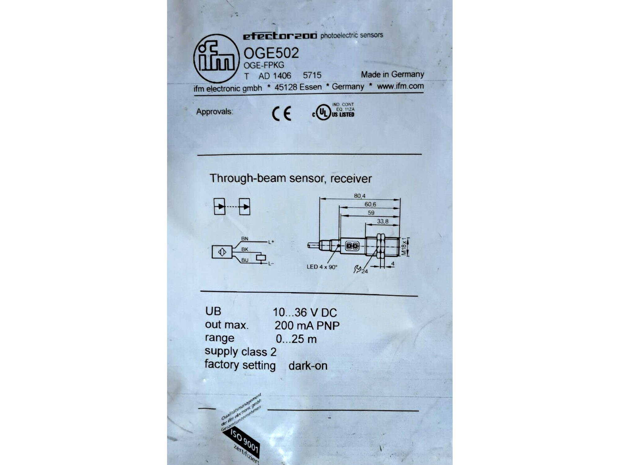 IFM OGE502 OGE-FPKG/2M Through-beam sensor receiver 1 PCS #AD1612#