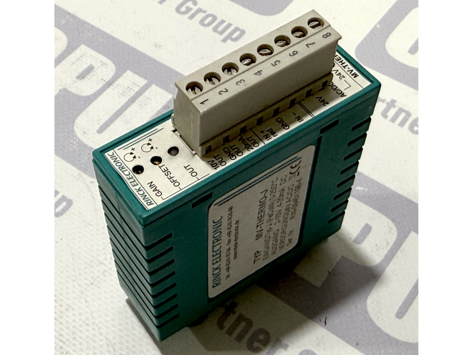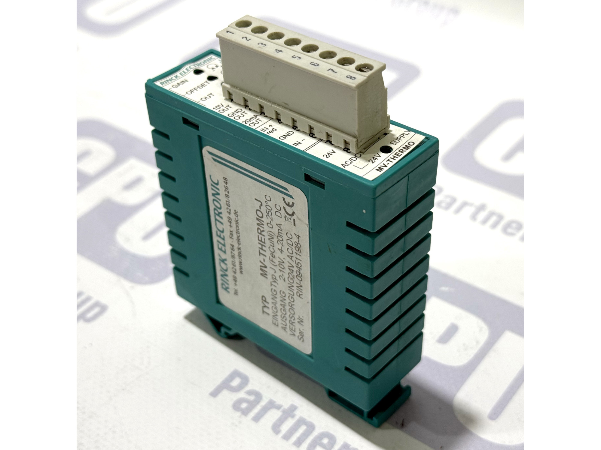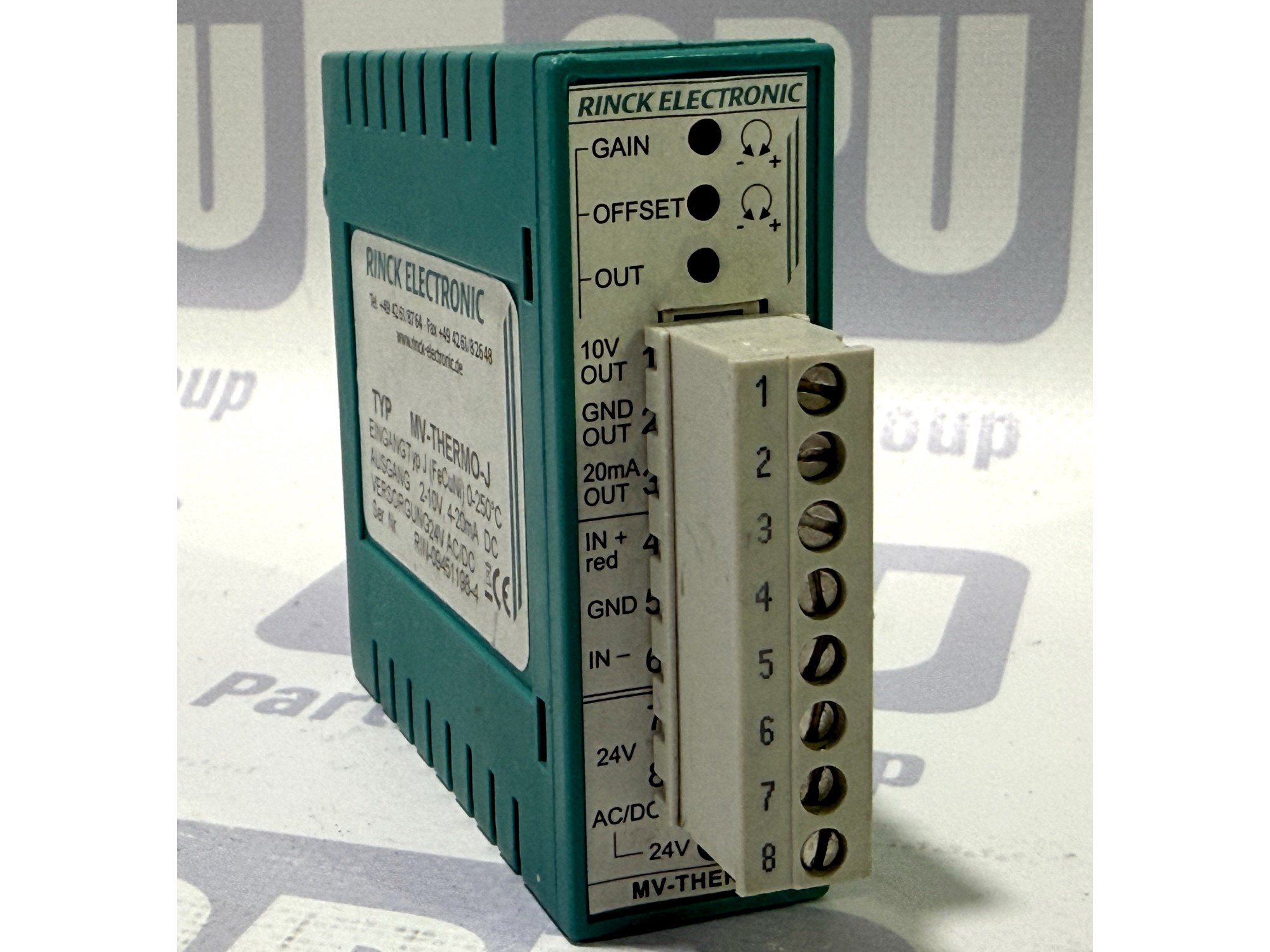 ОПИС ТОВАРУ: Rinck Electronic MV-THERMO-J — це професійний вимірювальний перетворювач, призначений для роботи з термопарами типу J (FeCuNi). Пристрій забезпечує точне перетворення сигналу температури в діапазоні від 0 до 250°C у стандартизовані аналогові сигнали напруги (2-10V) або струму (4-20mA). Модуль виконаний у компактному пластиковому корпусі для монтажу на DIN-рейку та оснащений знімною клемною колодкою для зручності підключення. На передній панелі розташовані потенціометри для точного налаштування підсилення (Gain) та зміщення (Offset).