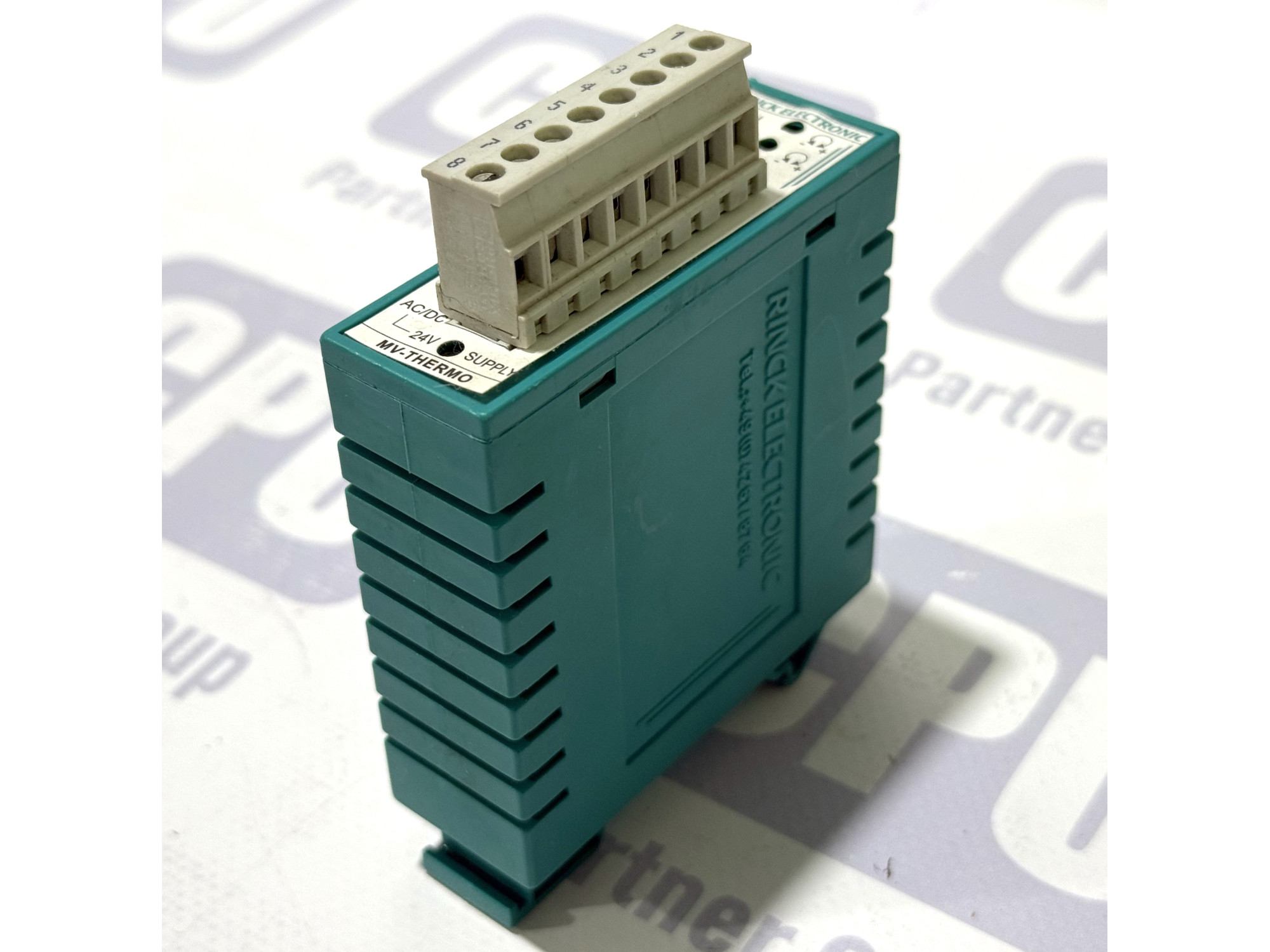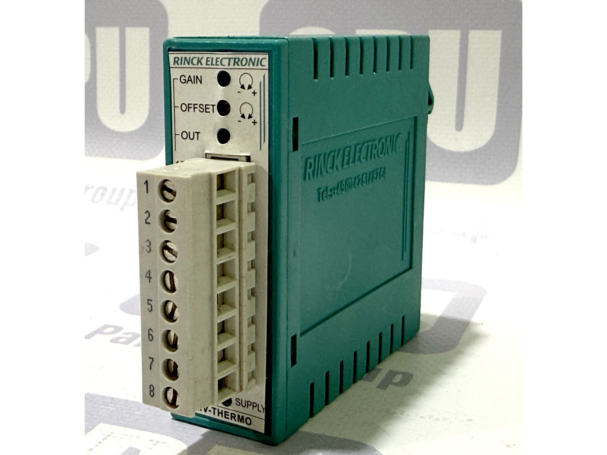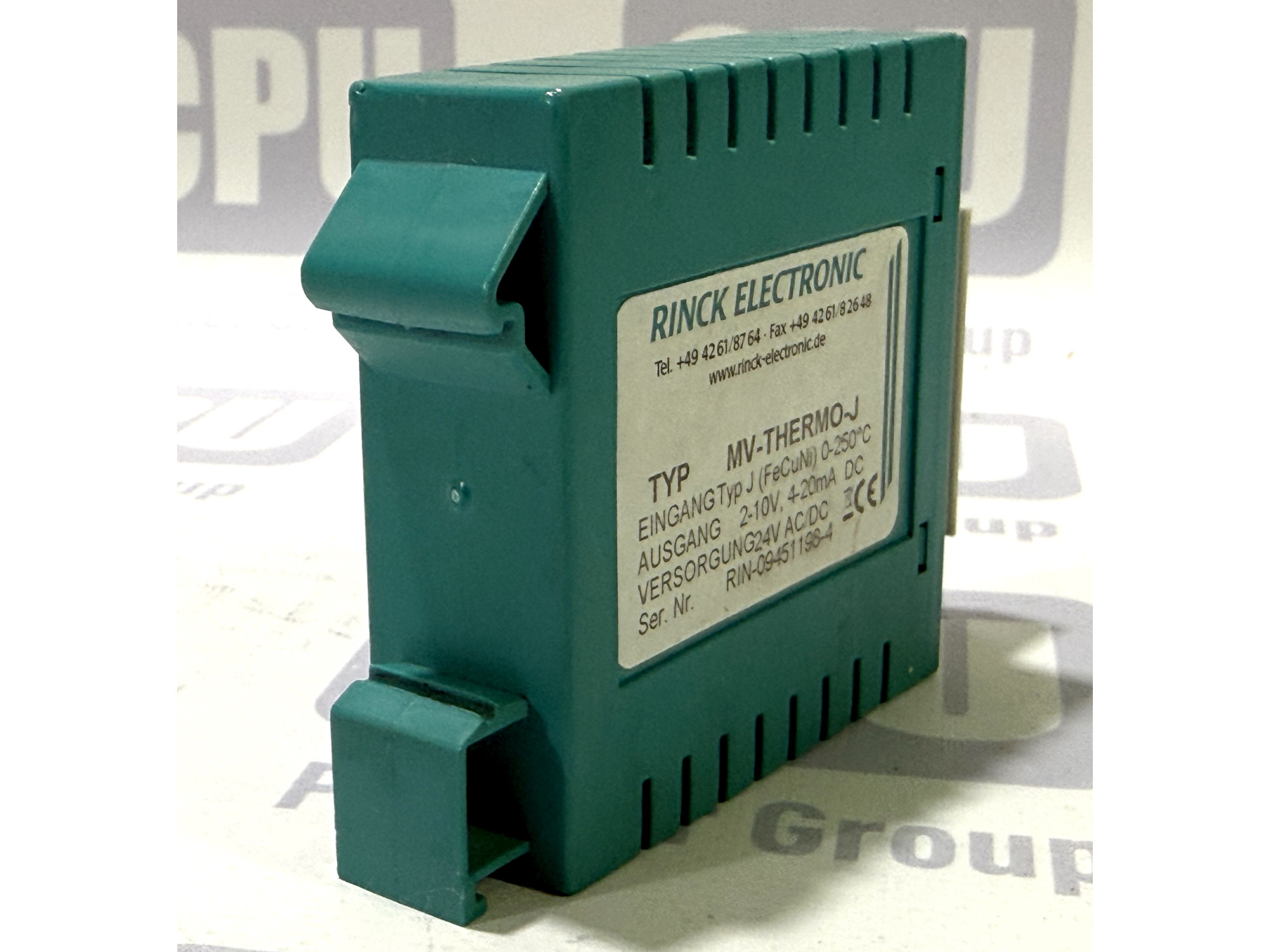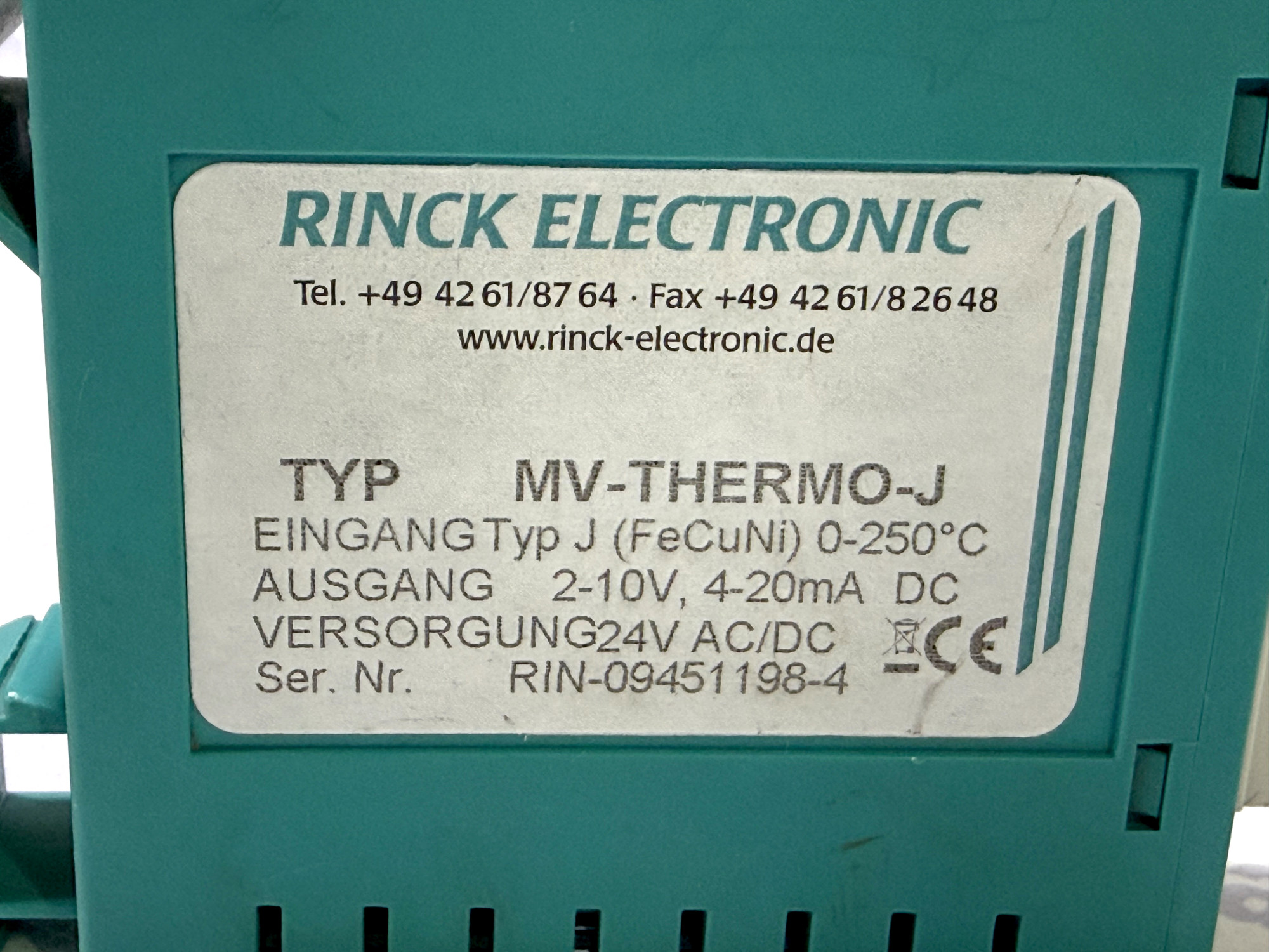 ОПИС ТОВАРУ: Rinck Electronic MV-THERMO-J — це професійний вимірювальний перетворювач, призначений для роботи з термопарами типу J (FeCuNi). Пристрій забезпечує точне перетворення сигналу температури в діапазоні від 0 до 250°C у стандартизовані аналогові сигнали напруги (2-10V) або струму (4-20mA). Модуль виконаний у компактному пластиковому корпусі для монтажу на DIN-рейку та оснащений знімною клемною колодкою для зручності підключення. На передній панелі розташовані потенціометри для точного налаштування підсилення (Gain) та зміщення (Offset).