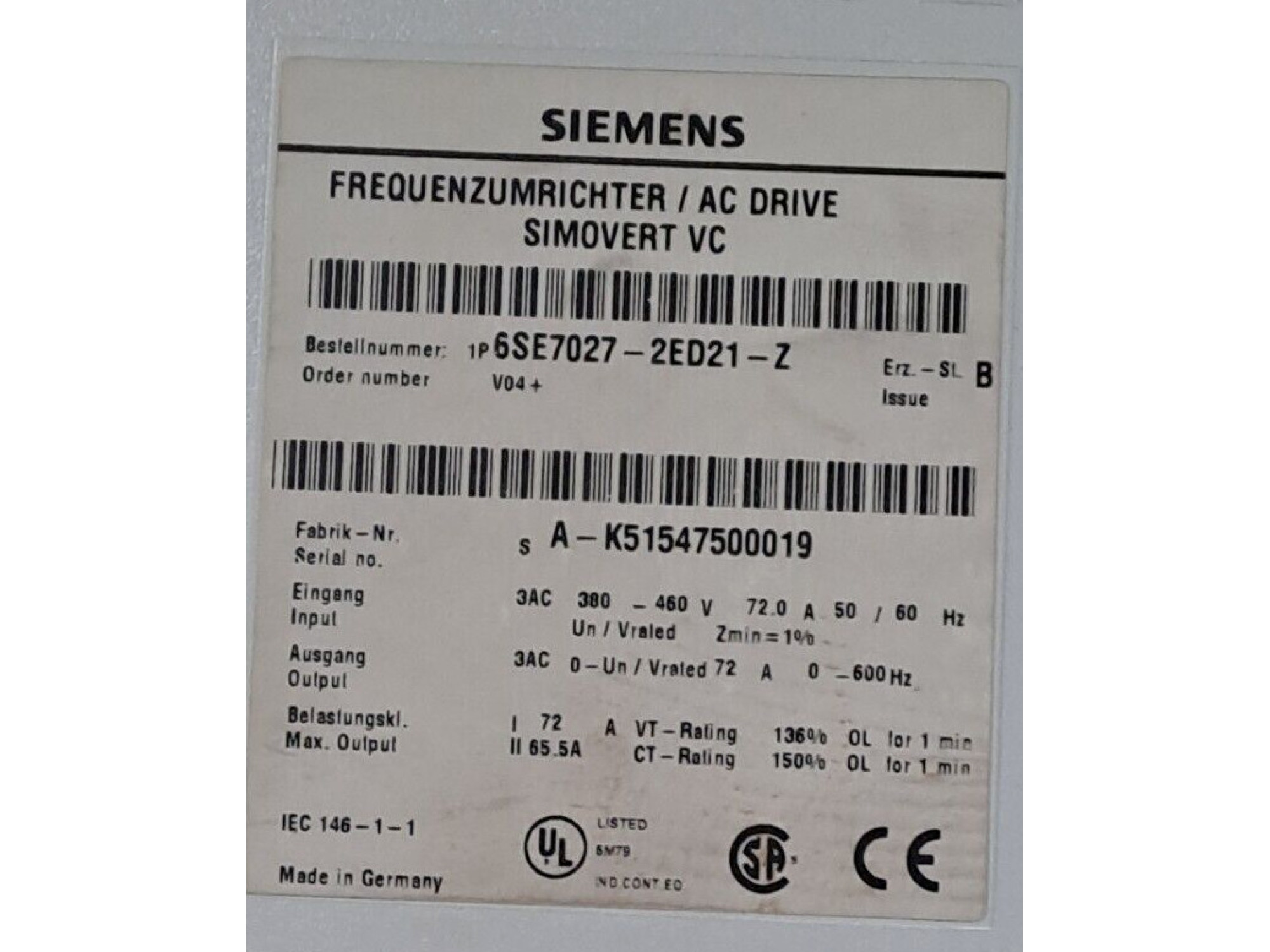 - Модель: 6SE7027-2ED21-Z